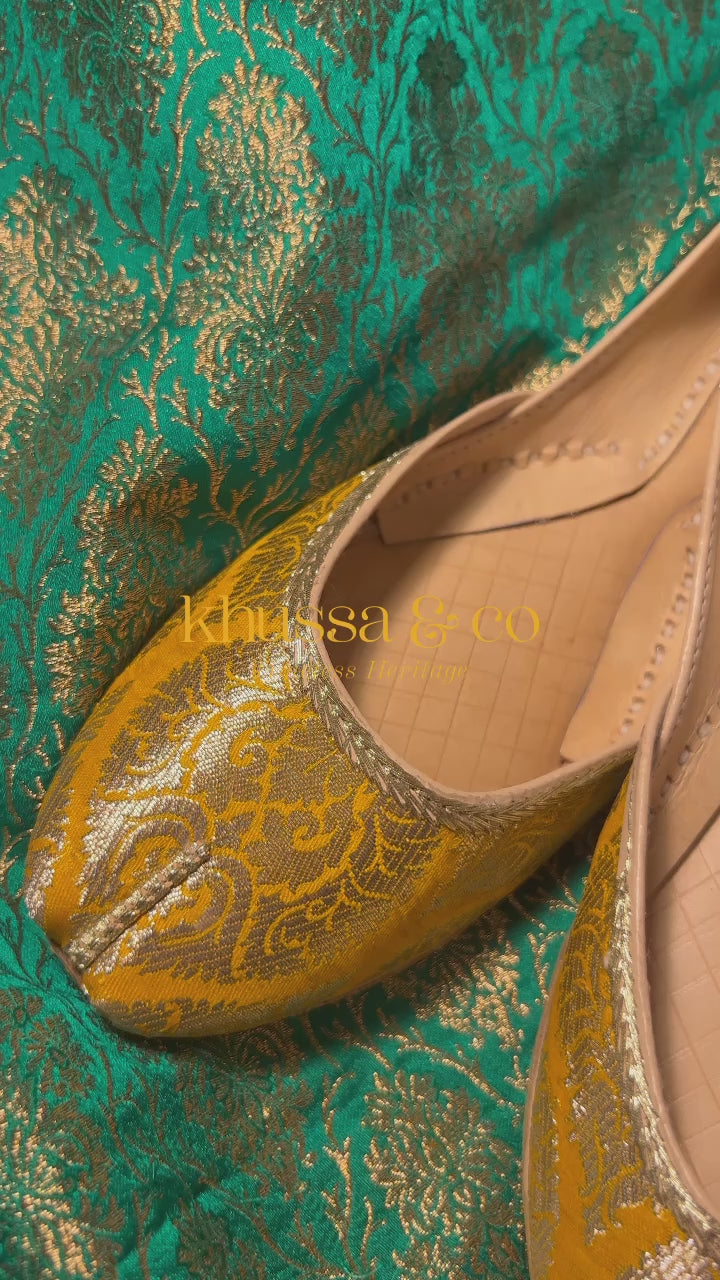 This vibrant yellow Banarsi Khussa is one of our brightest statement juttis! It makes you feel and look fresh and bright just like a perfect summers day.
